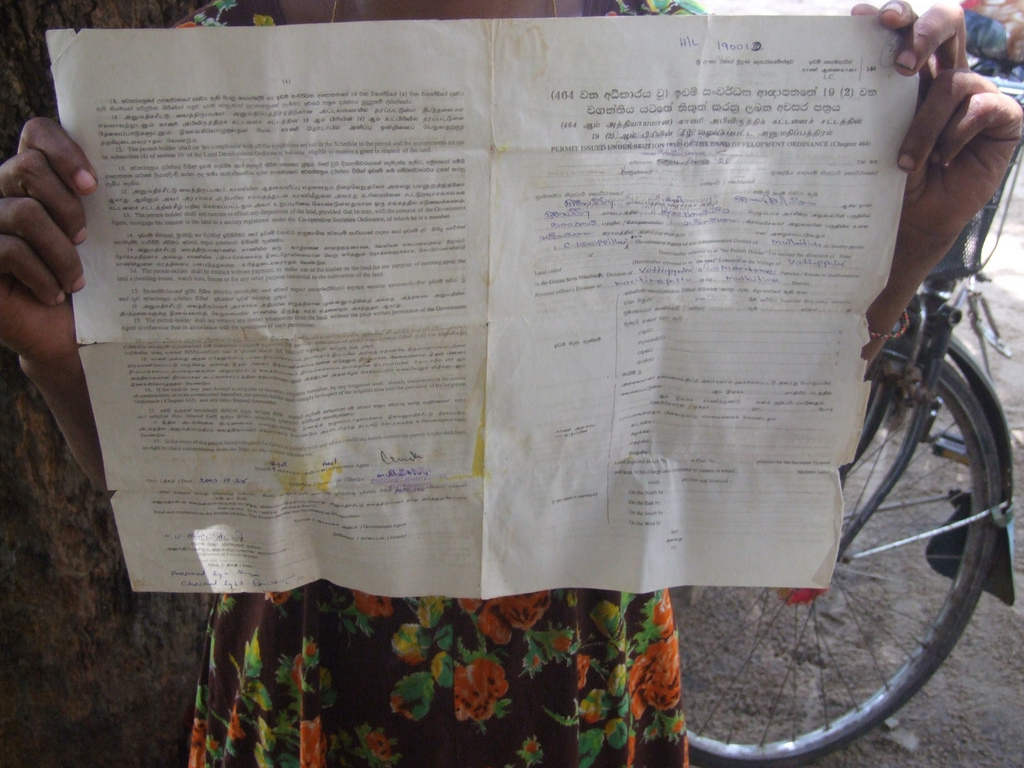 An IDP shows the deed to her land and house in Seeniyamottai. The property is currently occupied by the military ~ Photo by Dushiyanthini Kanagasabapthipillai.