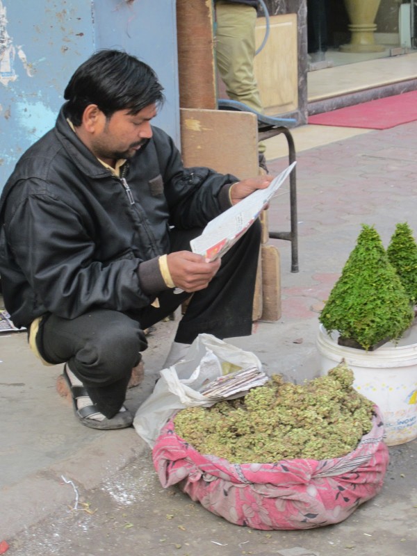 A vendor is seen busy reading the newspaper near the Golden Temple