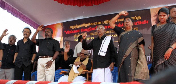 The demonstration was organised by the students’ wing of the DMK and the Tamil Eelam Supporters’ Organisation, a forum floated by Mr. Karunanidhi. The party cadre, wearing black shirts, gathered in large numbers near Valluvar Kottam at Nungambakkam. This was among the many protests held all over Tamil Nadu.