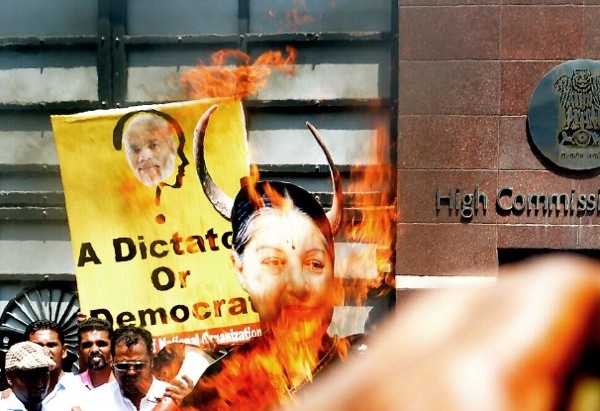 Hundreds of Sri Lankan nationalists on Tuesday staged a demonstration near the Indian High Commission in Colombo and burnt the effigy of Tamil Nadu Chief Minister J Jayalalithaa to protest against the “undue influence” from India on Colombo to implement the 13 th amendment.