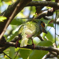 It is not shy of human presence and does not get frightened by the noise made by traffic and other human activities. The only bird that can be confused with the Small Barbet is the Crimson-breasted Barbet. However, it has a bright lemon-yellow on the its face instead of blue, and the breast has dark green streaks on a yellow-green background as opposed to the uniform green breast and abdomen of the Small Barbet.