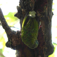 The green colour of its body provides it with a perfect camouflage and it is difficult to spot it when lurking amongst the foliage. Its flight is fast and powerful with rapid fluttering of the wings. It often makes short flights between trees but can easily fly over a distance when needed.