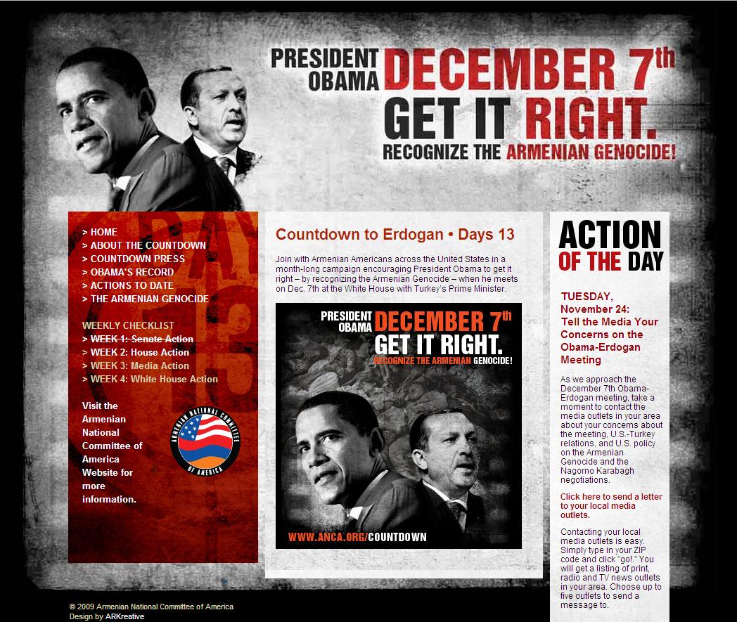Apart from aid issues, both ANCA and AAA focus efforts around a strong anti-Turkish and anti-Azerbaijani agenda, such as the blocking of U.S. financial and military aid to Turkey and Azerbaijan, pressing resolution of the Nagorno-Karabakh conflict between Armenia and Azerbaijan in favor of the former, and seeking legislative recognition of the alleged Armenian genocide (Cameron, 91).